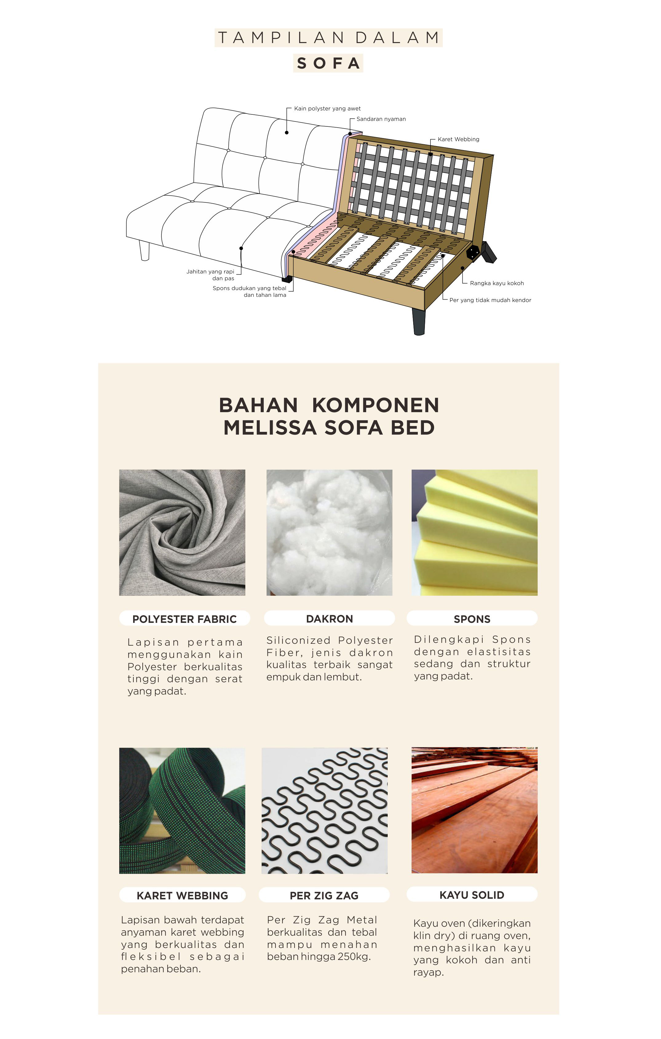 BAHAN: Rangka kayu & plywood, cover polyester, busa high density dengan spring, kaki plastik & kayu mahoni (kuat hingga 200kg).