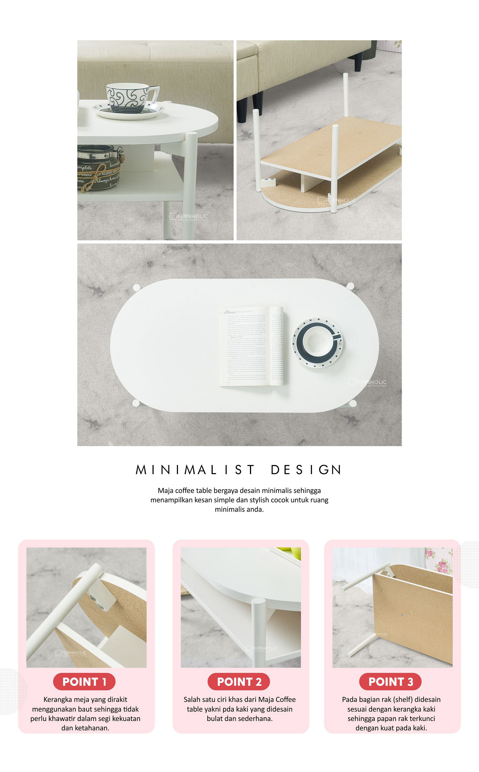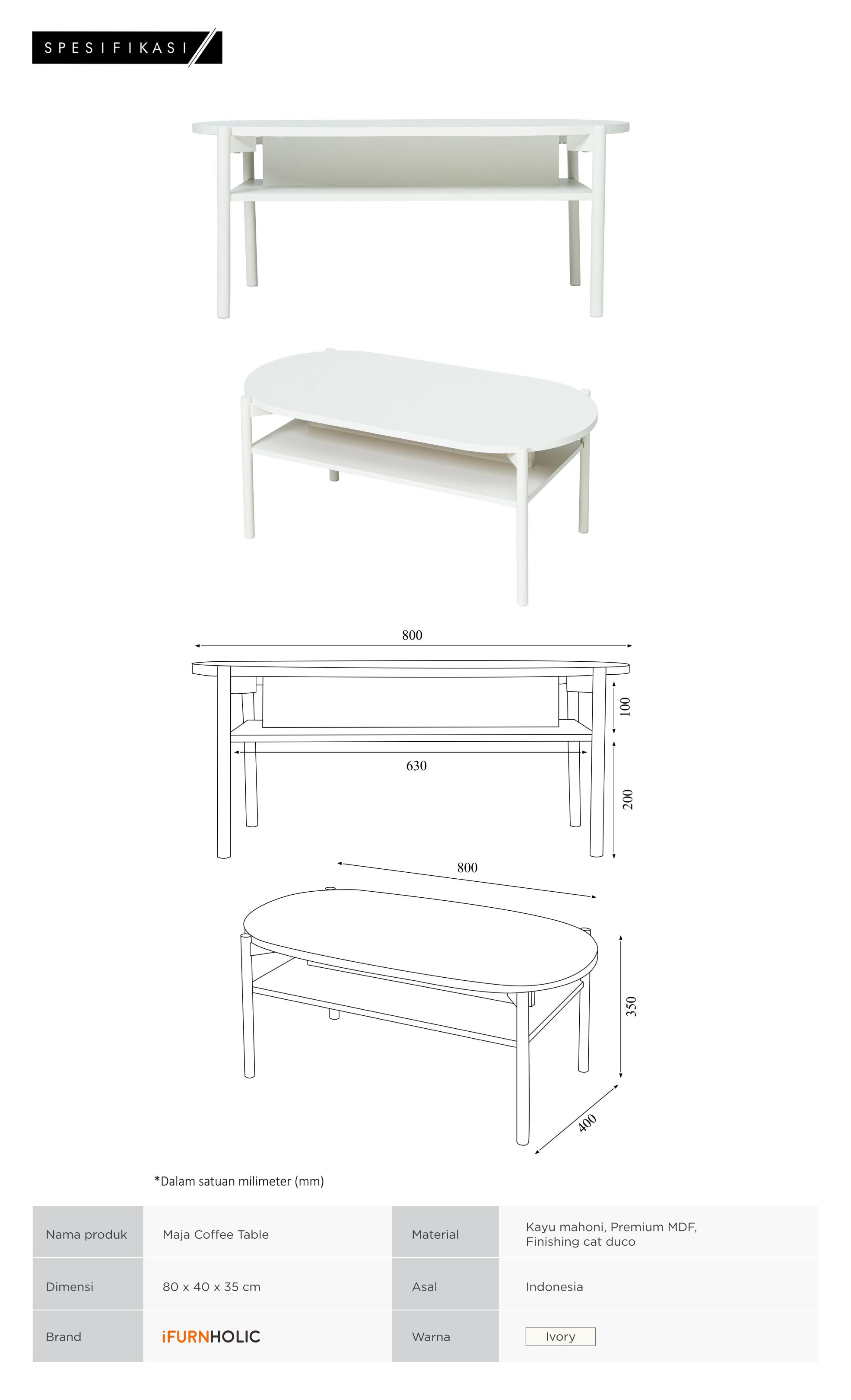 - Maja Coffee Table Ivory : meja kopi minimalis dengan warna ivory elegan, cocok untuk menemani sofa Anda sekaligus mempercantik ruang tamu.