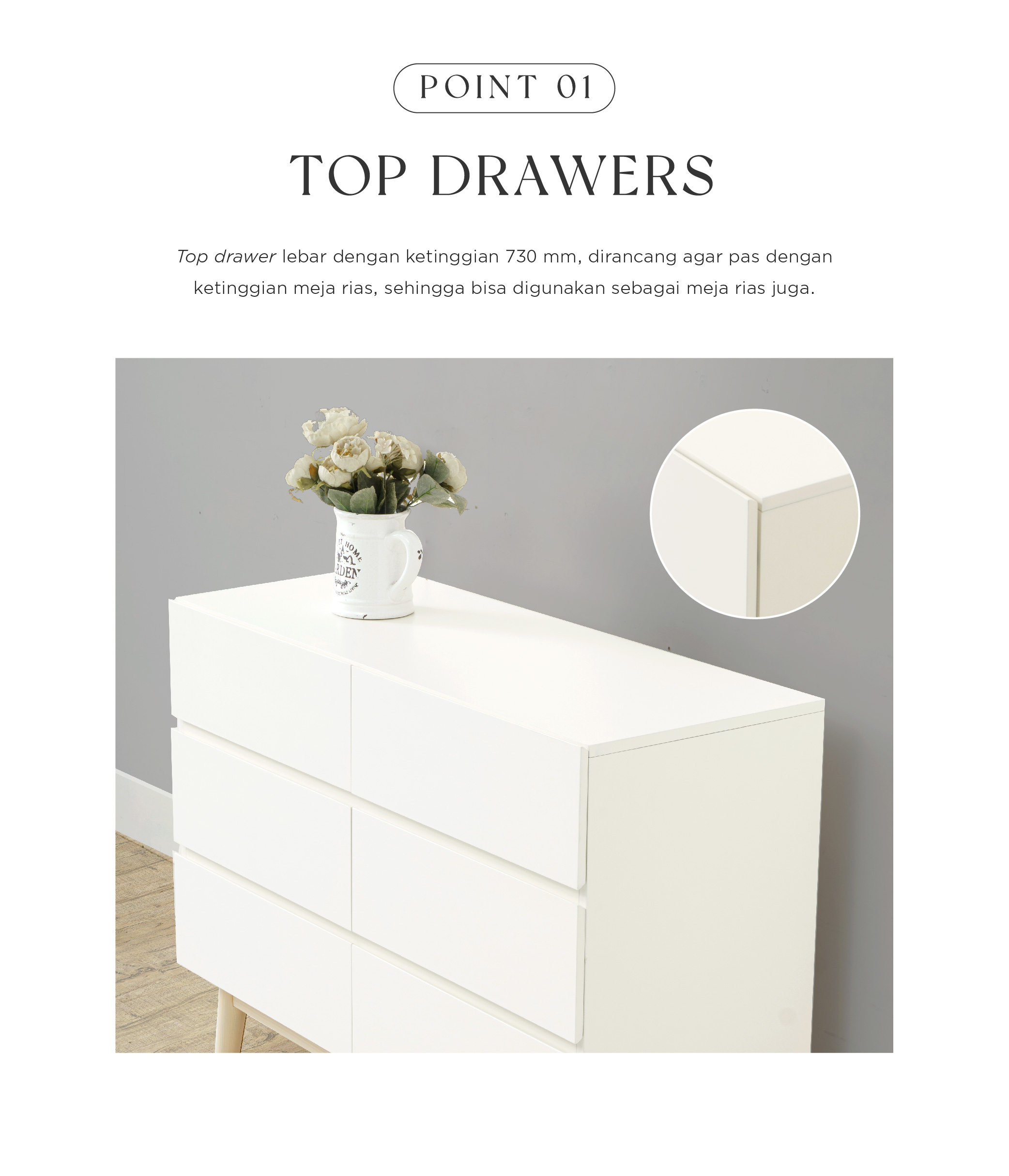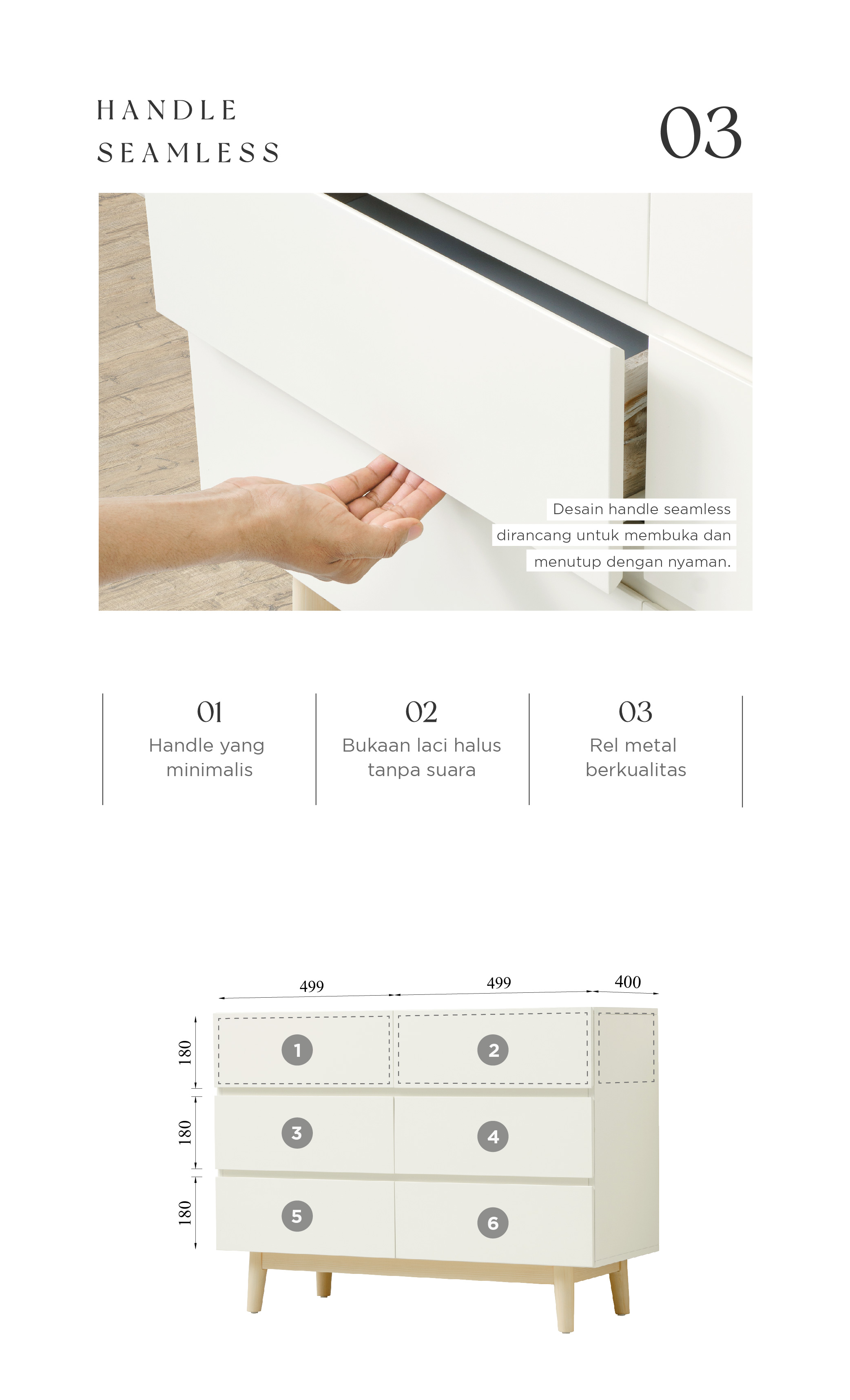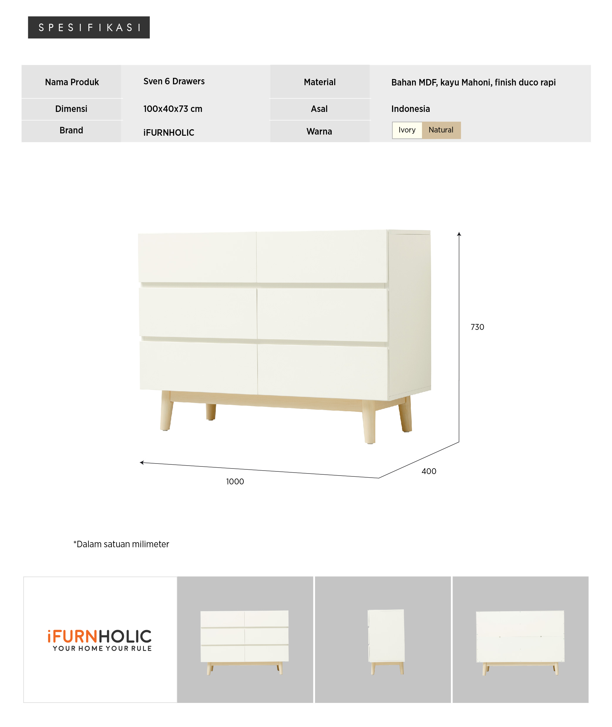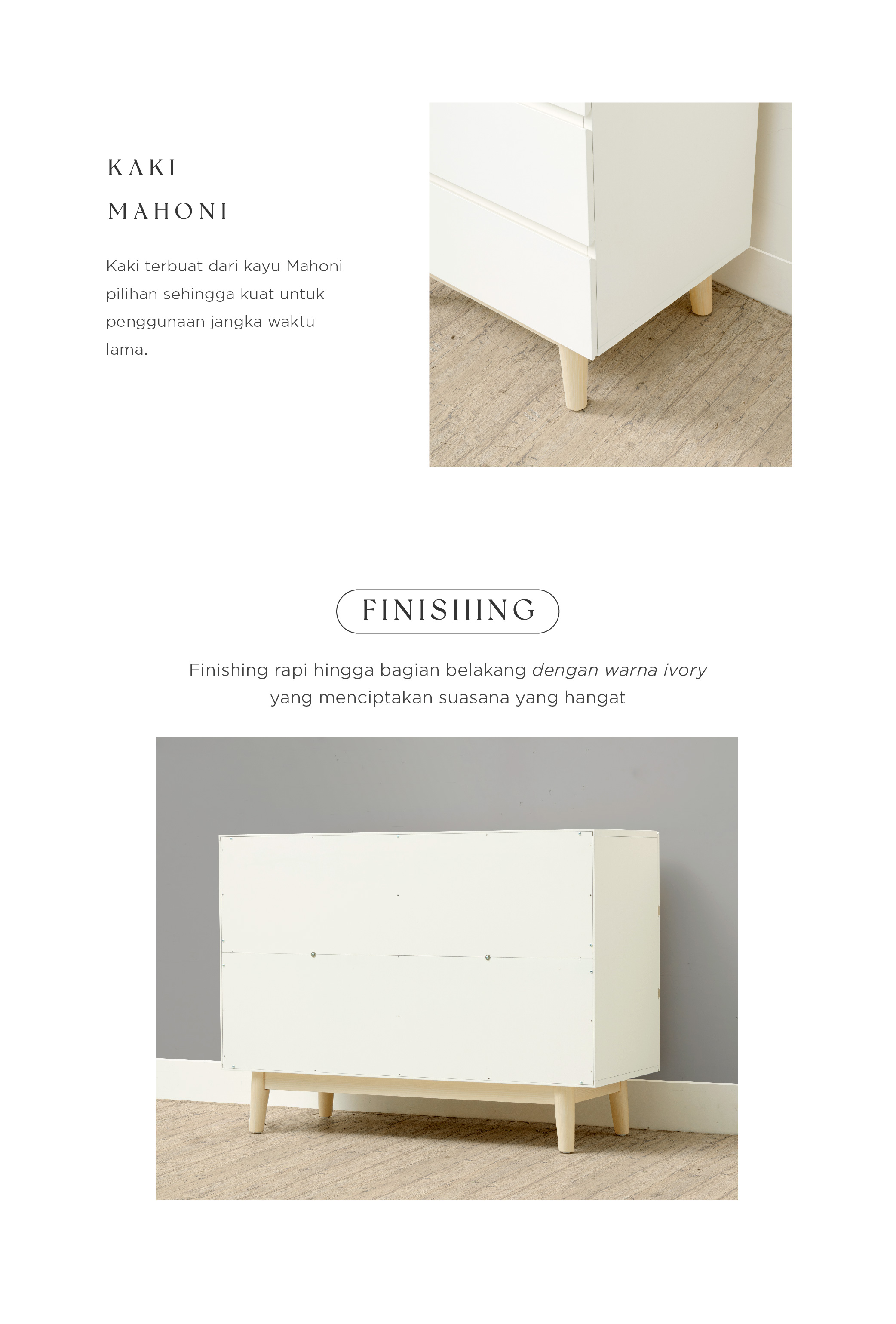 WARNA: Ivory kombinasi Natural UKURAN (cm) Panjang 100 | Lebar 40 | Tinggi 73 Tinggi tiap laci 18 Tinggi kaki 15 BAHAN Bahan MDF, kayu Mahoni, finish duco rapi