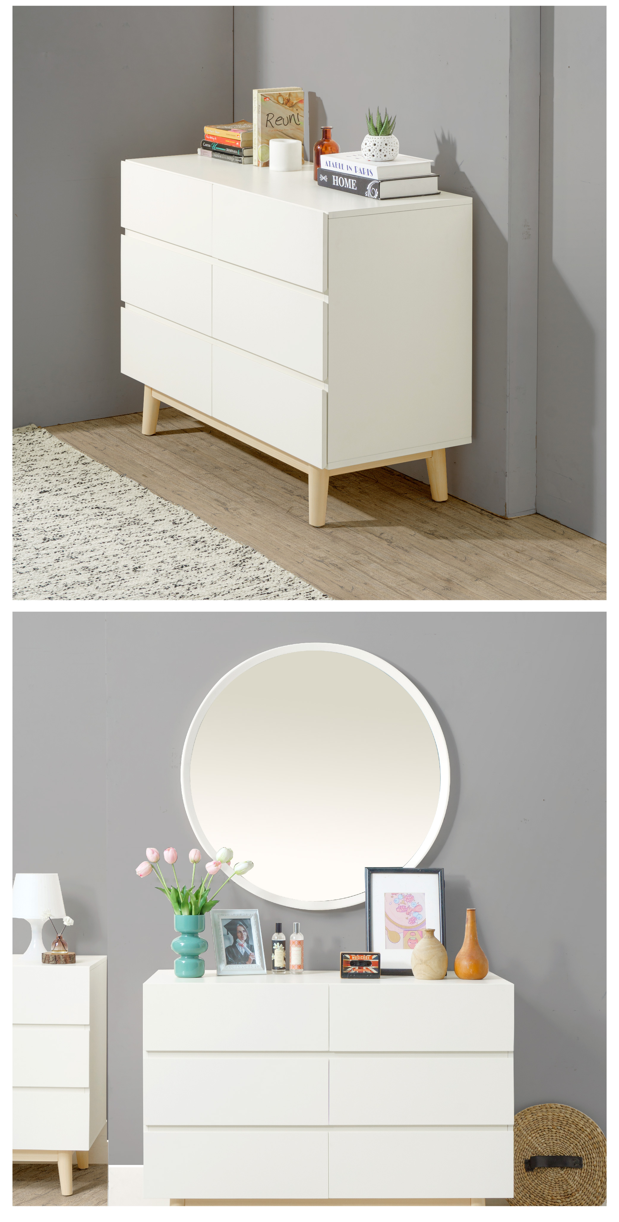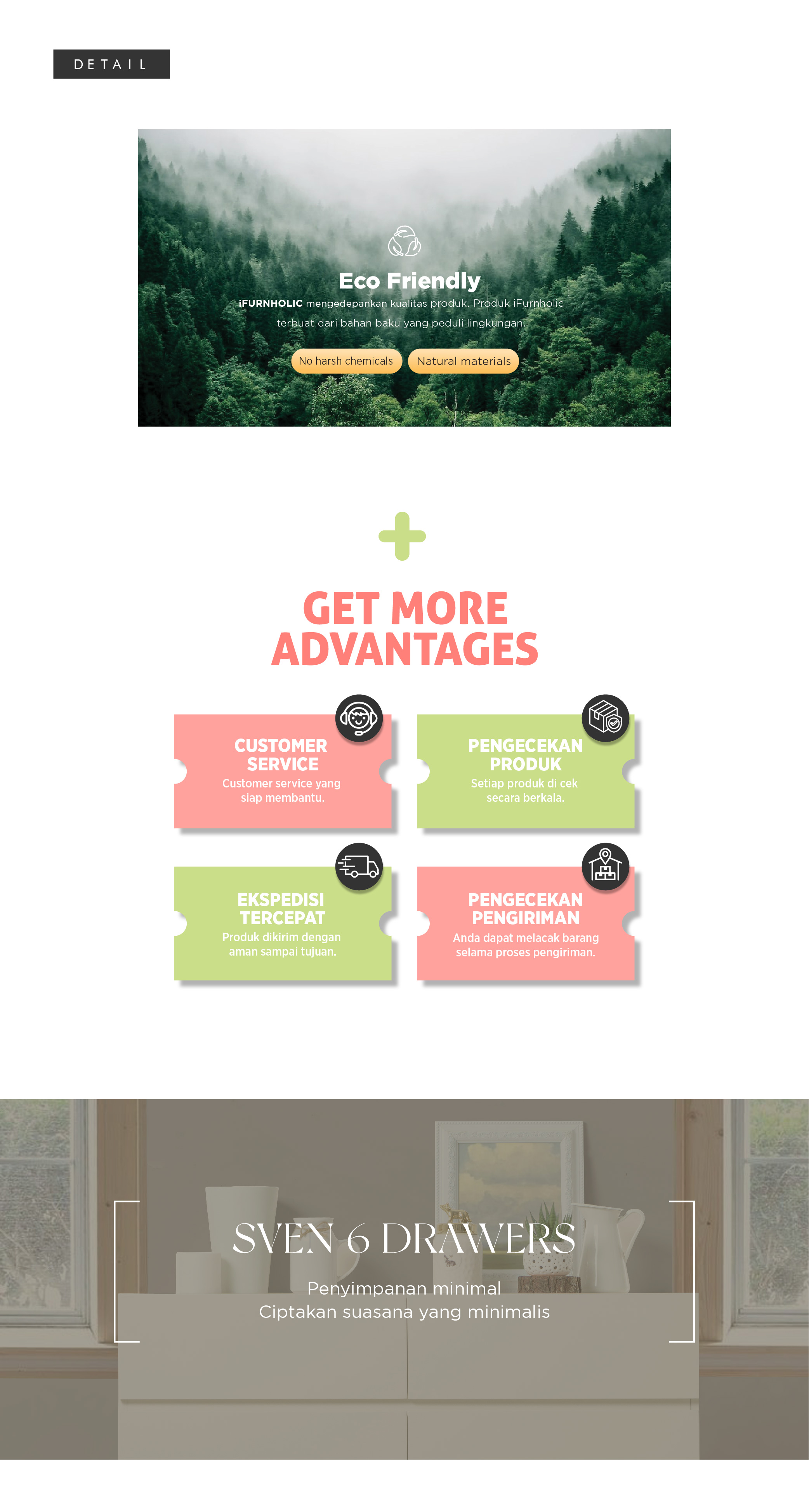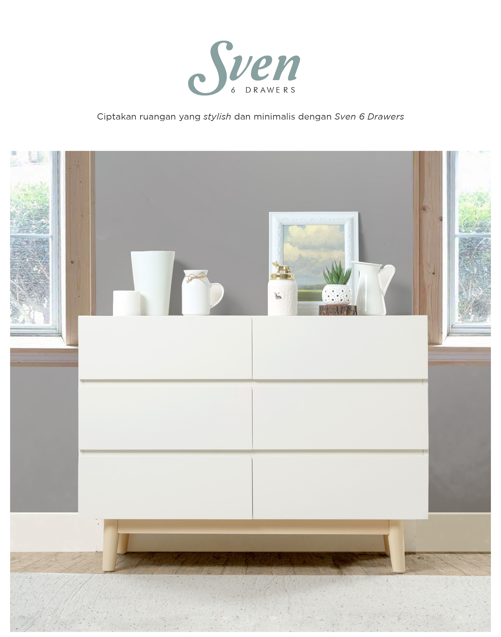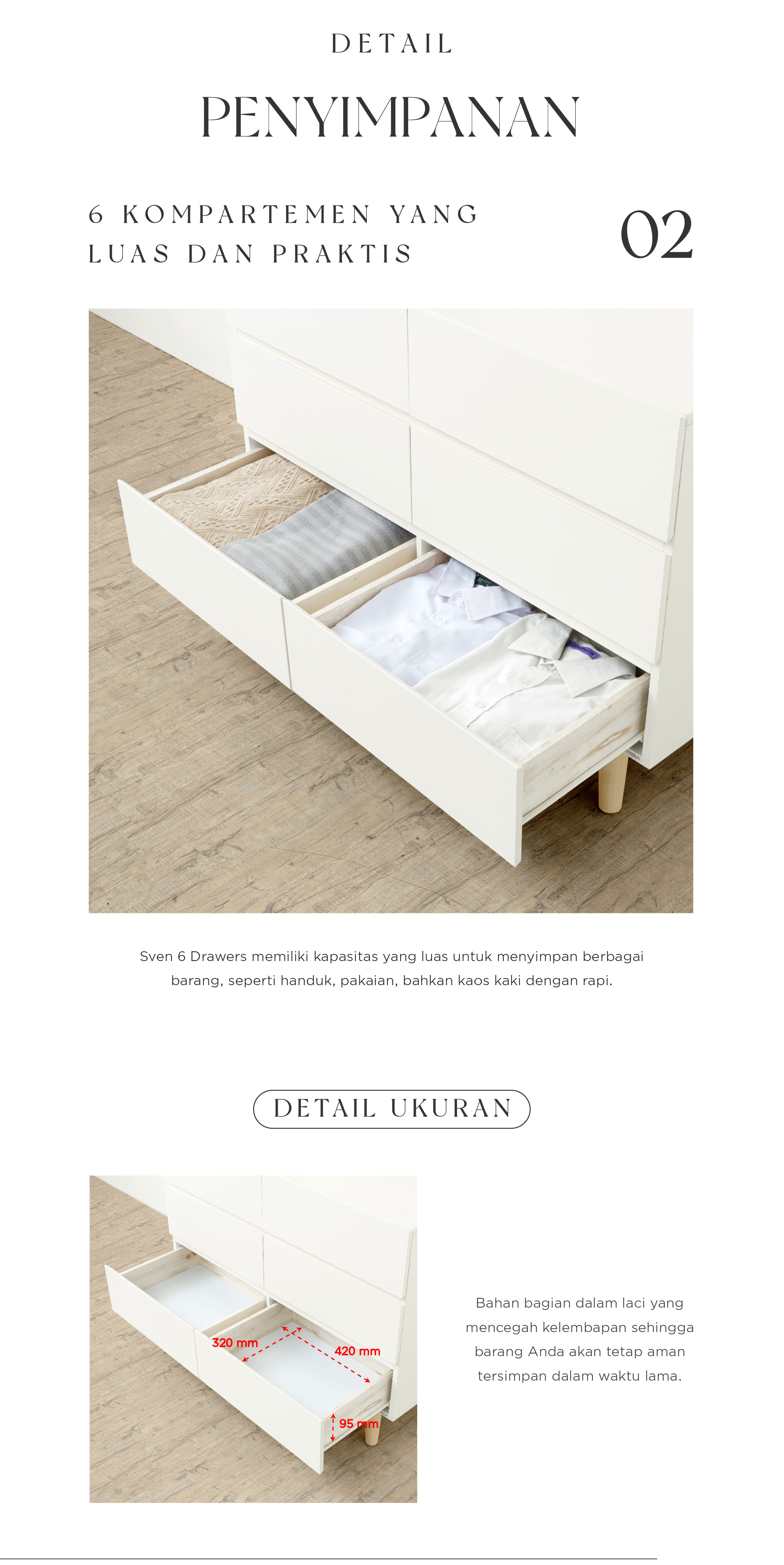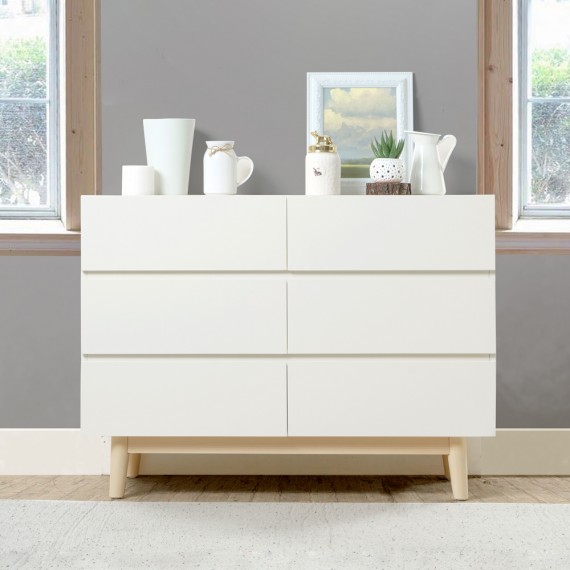 WARNA: Ivory kombinasi Natural UKURAN (cm) Panjang 100 | Lebar 40 | Tinggi 73 Tinggi tiap laci 18 Tinggi kaki 15 BAHAN Bahan MDF, kayu Mahoni, finish duco rapi