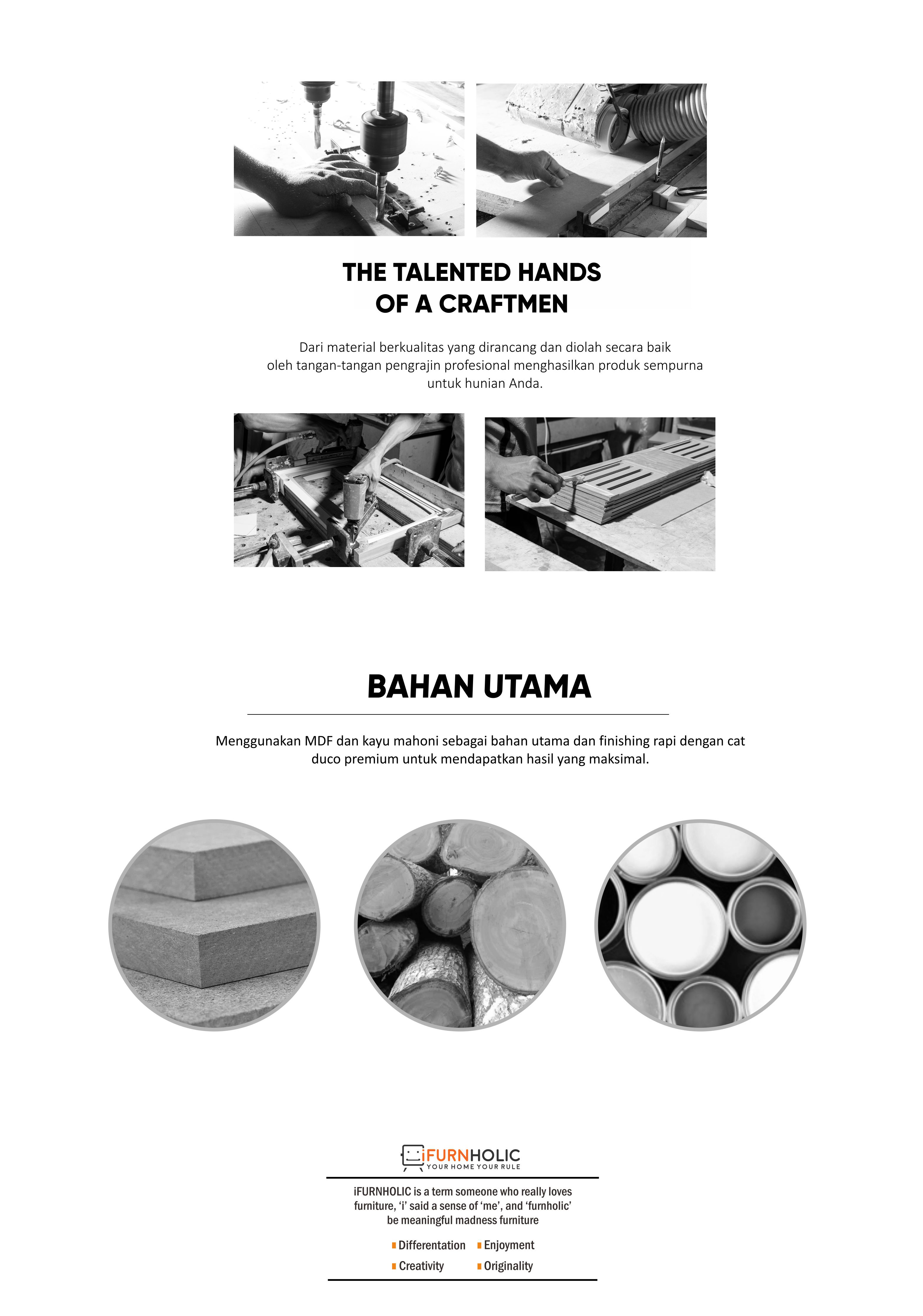 Bahan MDF, kayu Mahoni, finish duco rapi